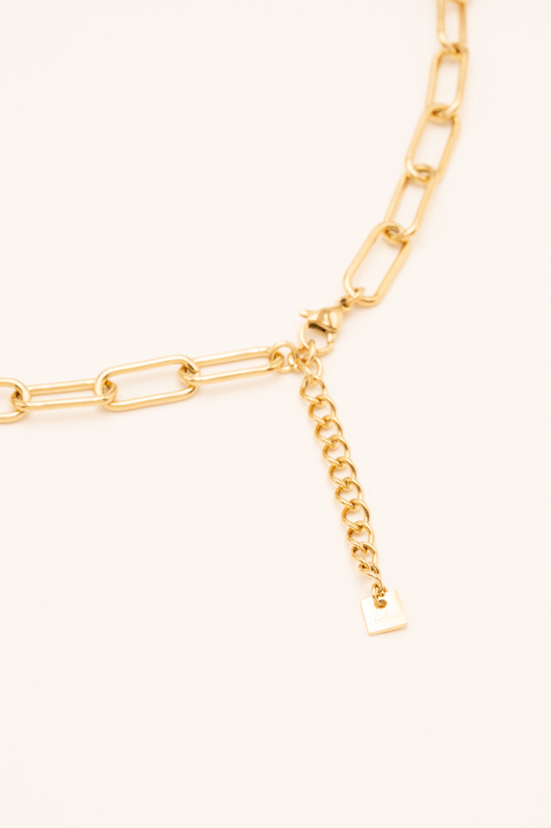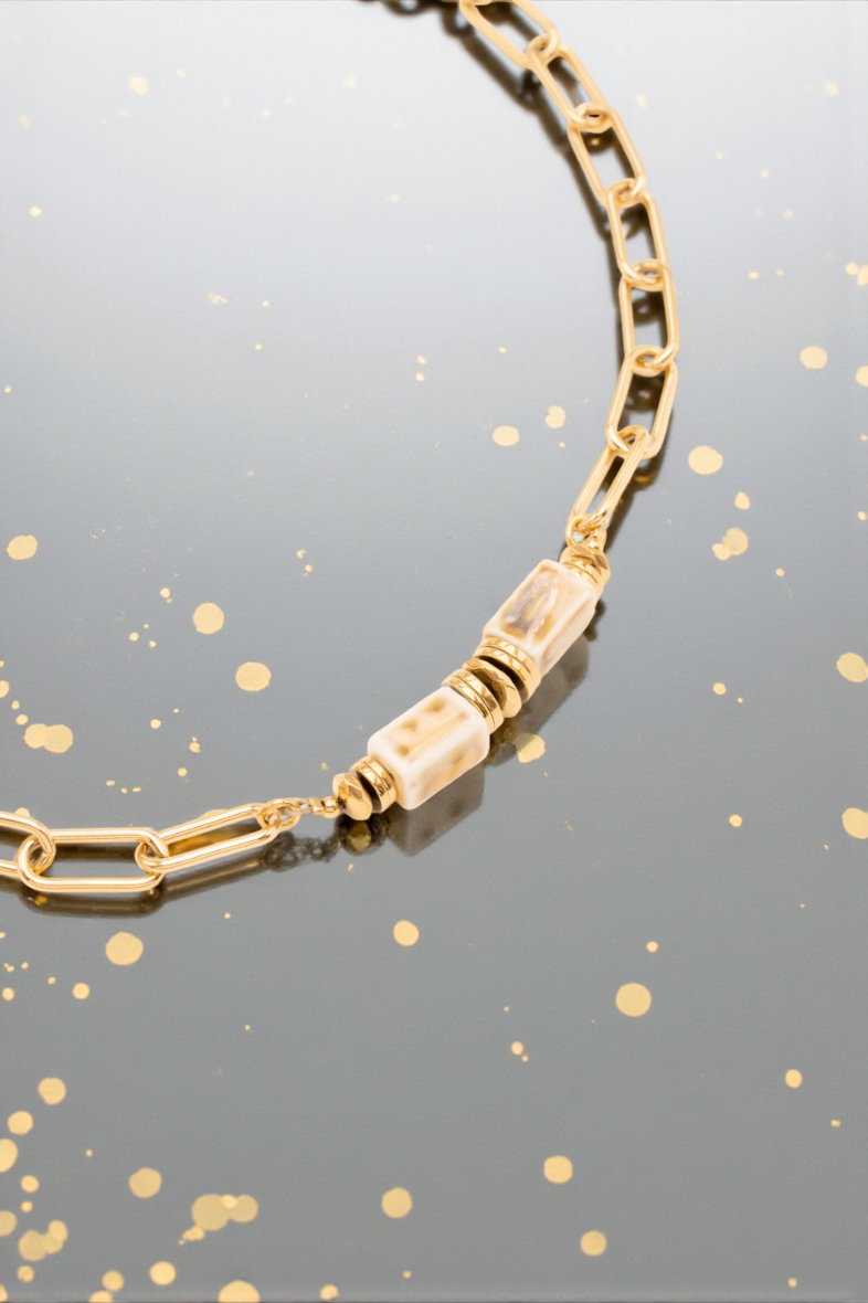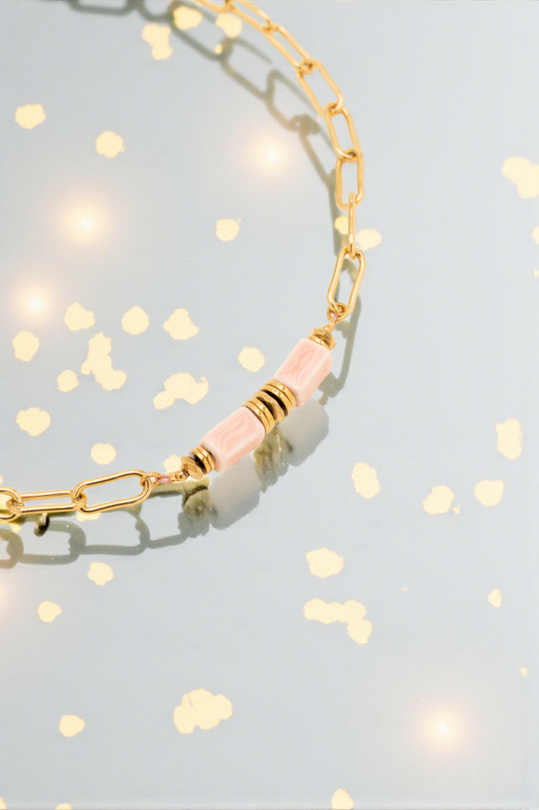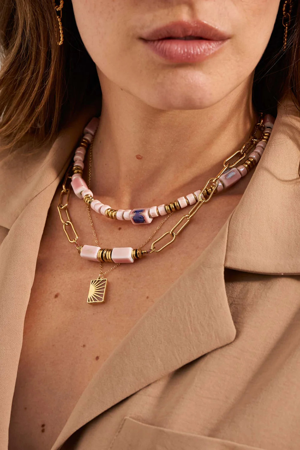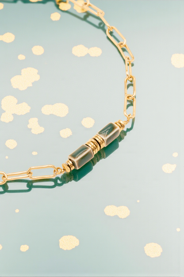 Collier en acier inoxydable sur maille composé de perles en acier inoxydable et de céramiques teintées.