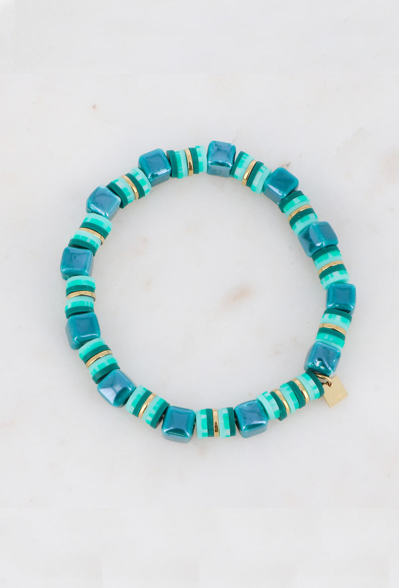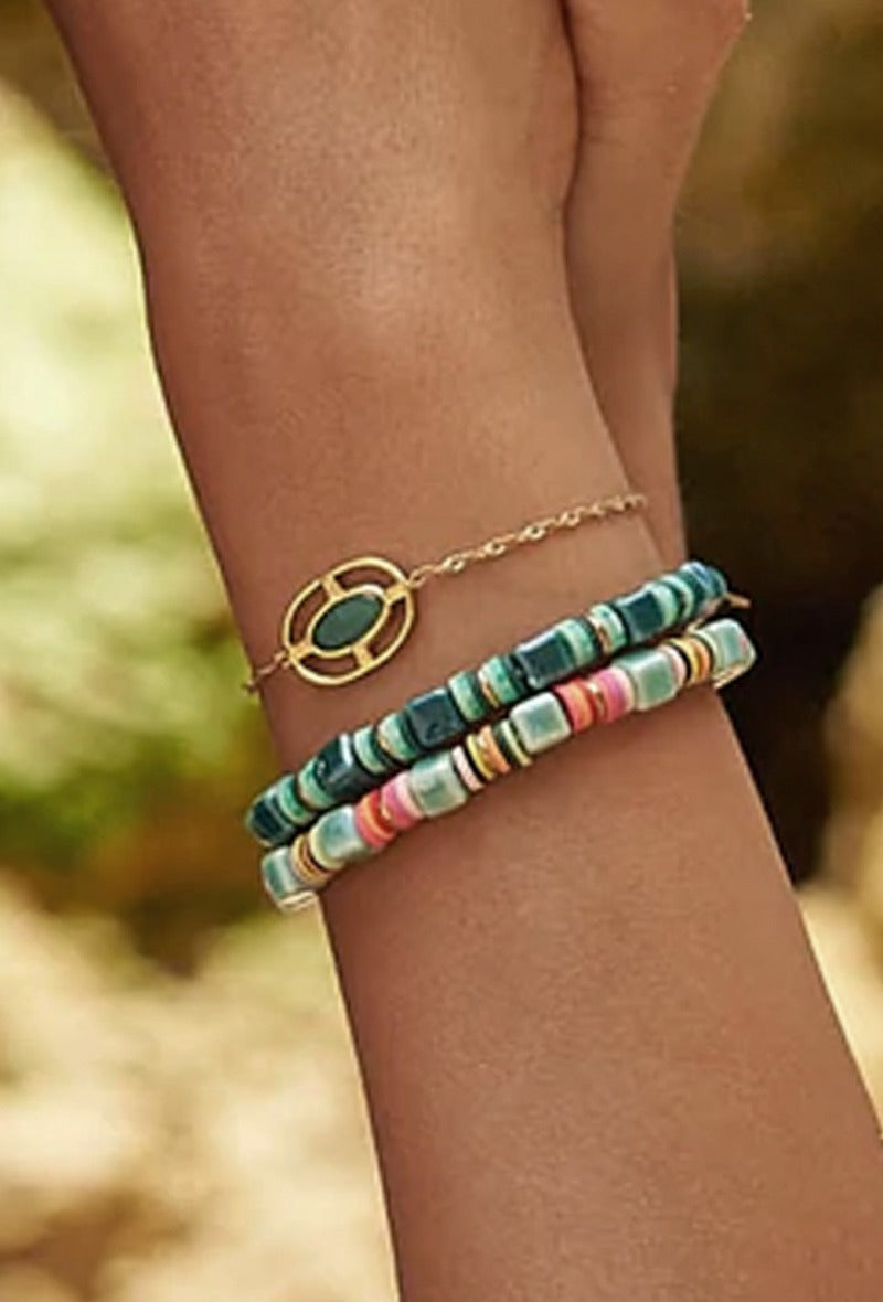 Bracelet élastique, orné de perles en acier inoxydable, de perles Heishi et de perles en céramique teintée. Longueur du bracelet : 16,5 cm
