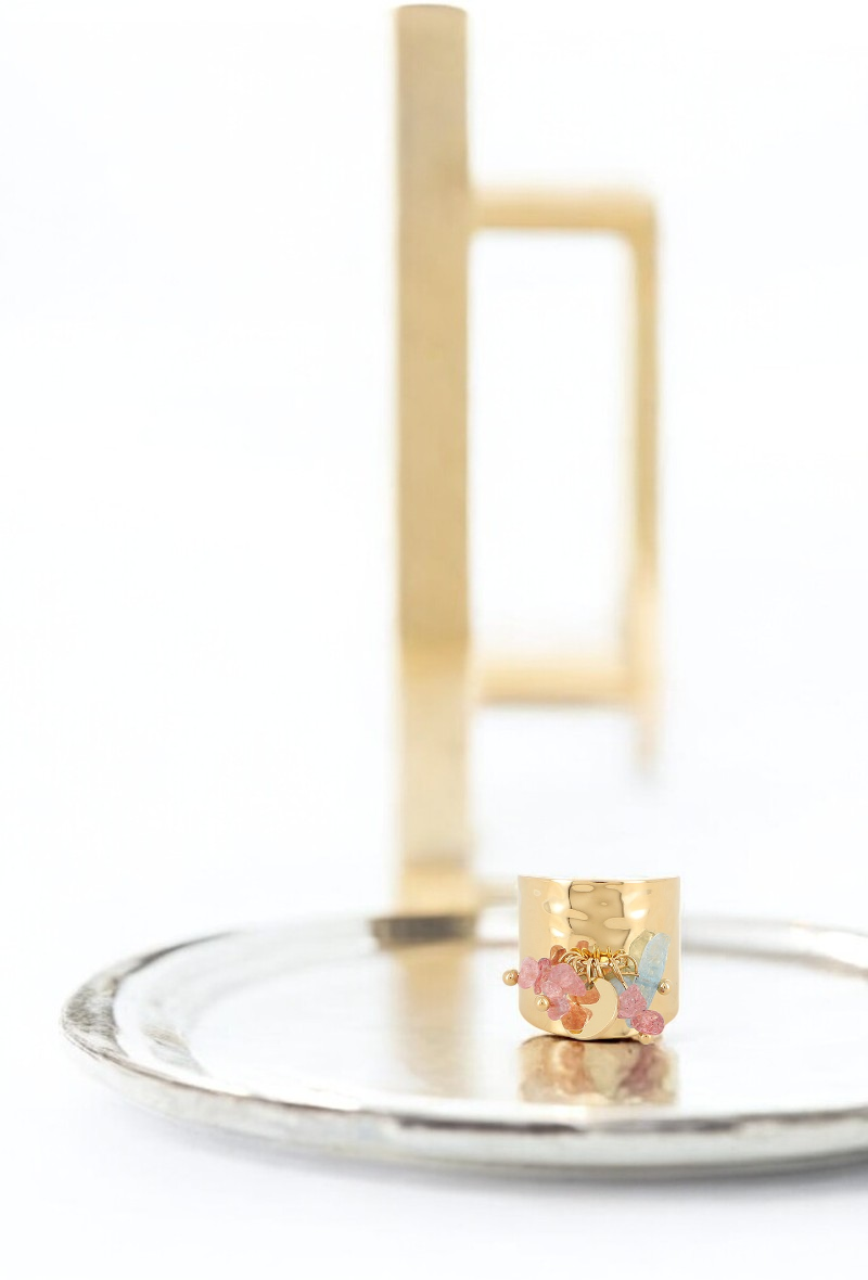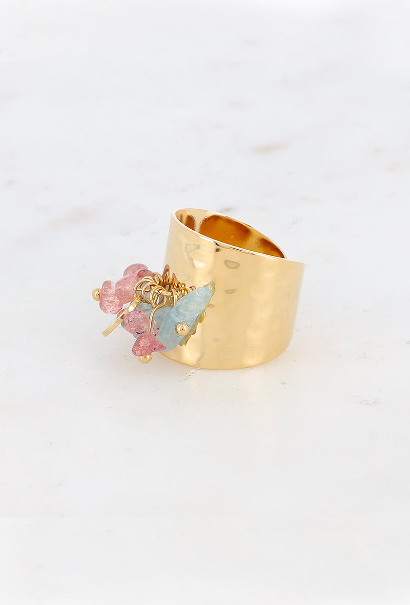 Bague large effet martelée en acier inoxydable composée d’une pampille ronde et de petites pierres naturelles.