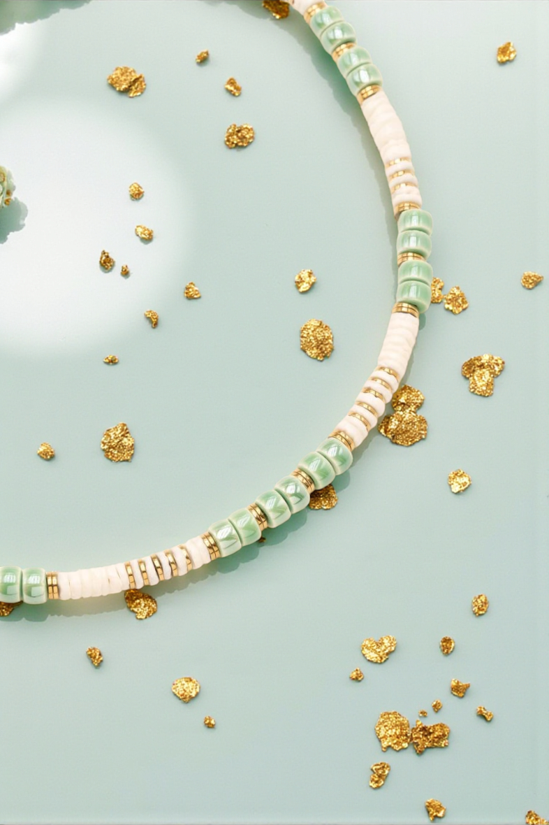 Collier sur fil orné de perles en acier inoxydable et de perles coquillages et de perles en céramique teintée. Longueur du collier : 45 cm Longueur de la chaîne : 38cm Longueur de la chaîne de réglette: 7cm