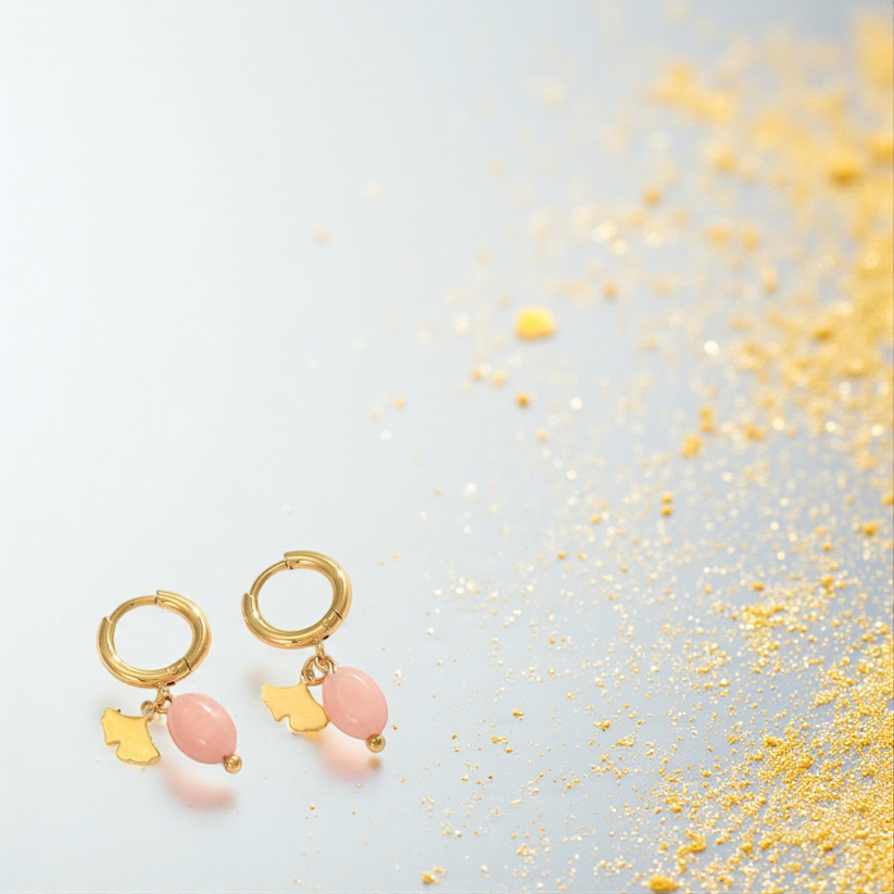 Boucles d’oreilles mini créoles perles roses et fleur de ginkgo dorées.
