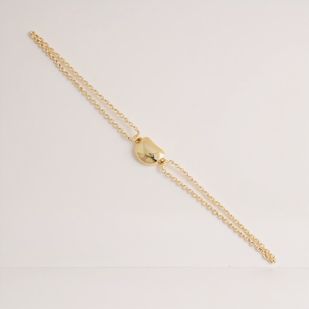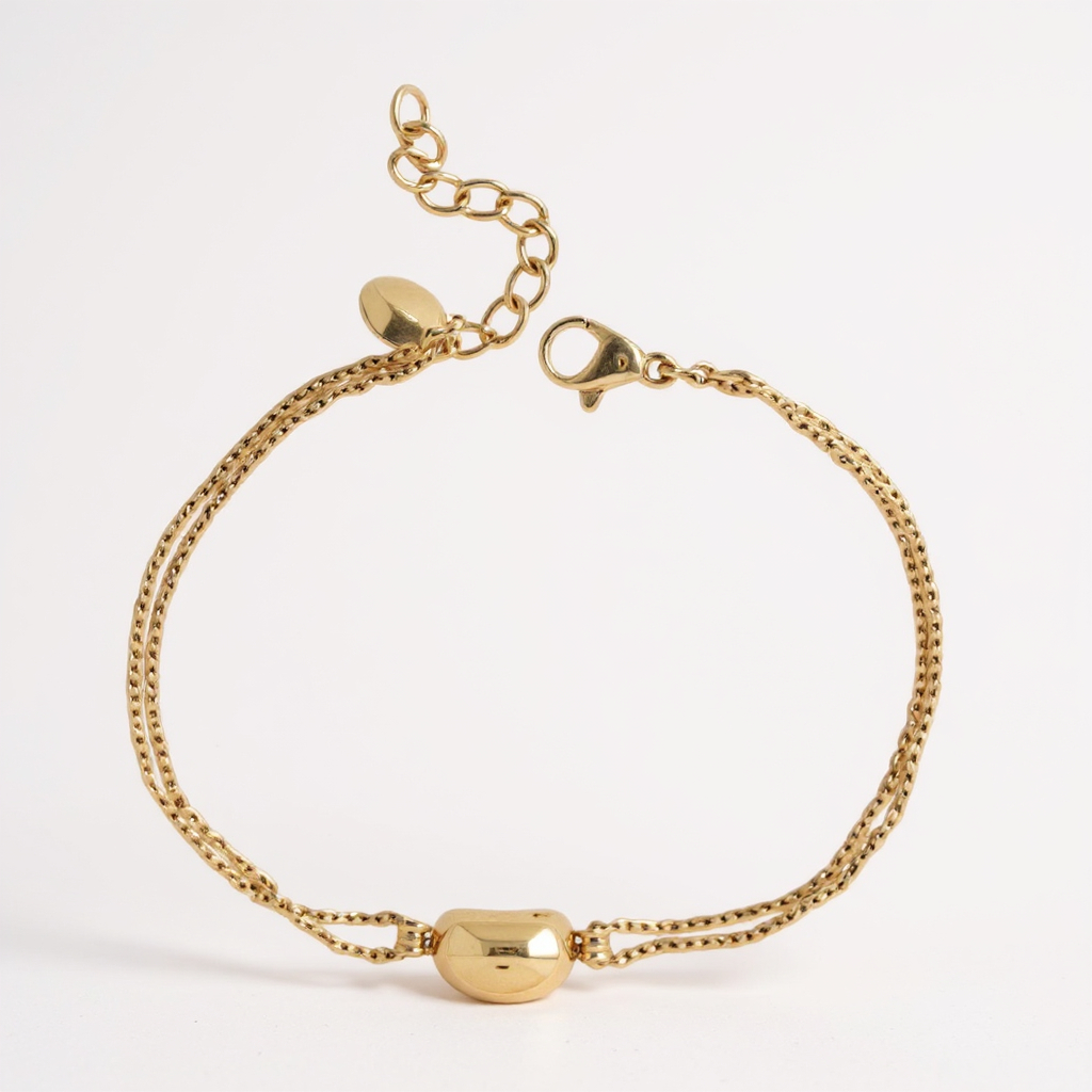 Bracelet sur chaîne en acier inoxydable composé d'une maille avec un pendentif en forme de petit haricot.