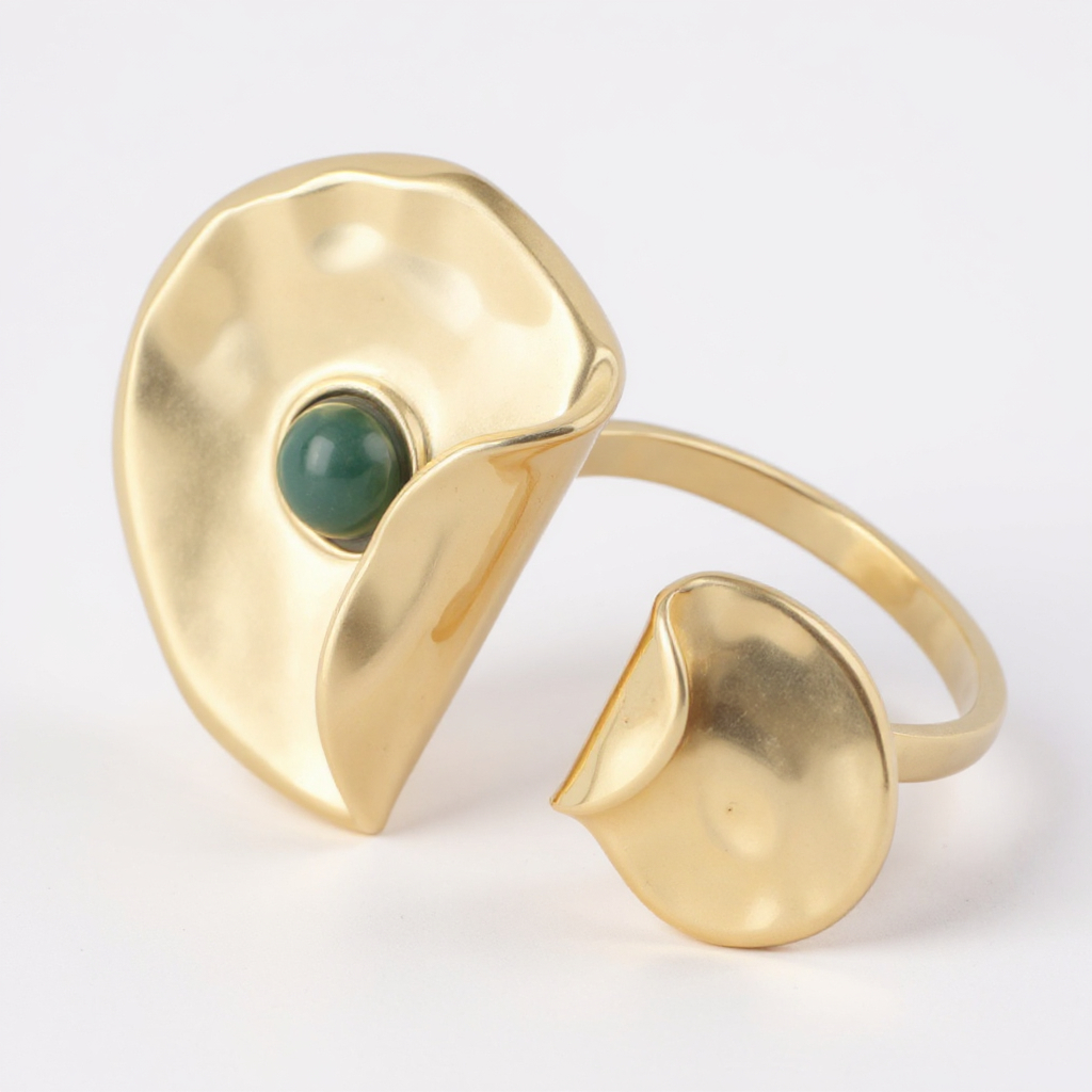 Bague en acier inoxydable avec une ouverture par l'avant, composée de deux pièces rondes recourbées et martelées et sertie d'une pierre naturelle ronde. Jaspe Vert