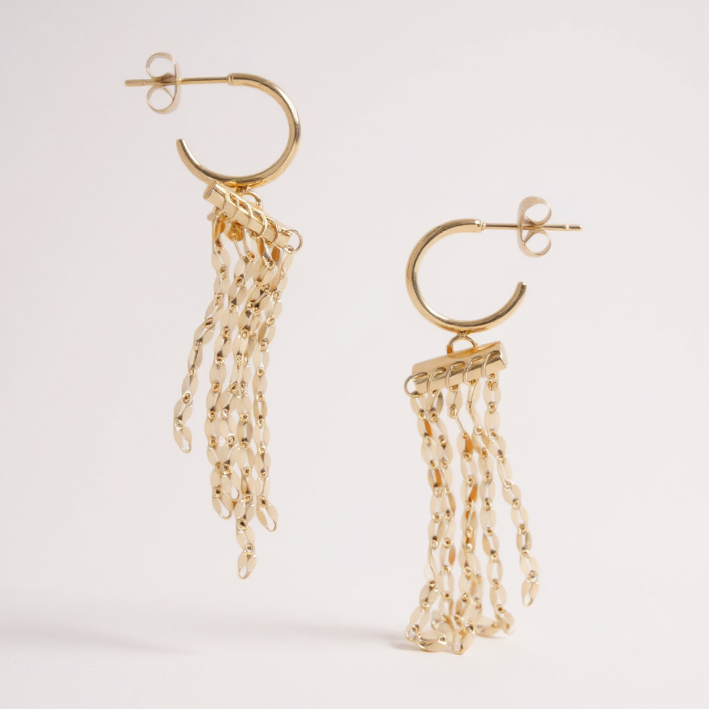 Boucles d'oreilles type créoles ornées de 5 chaînes pendantes.
