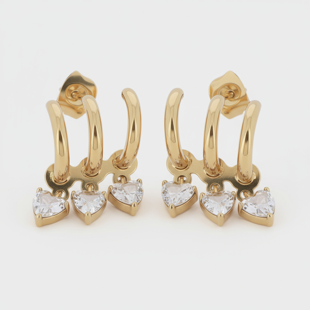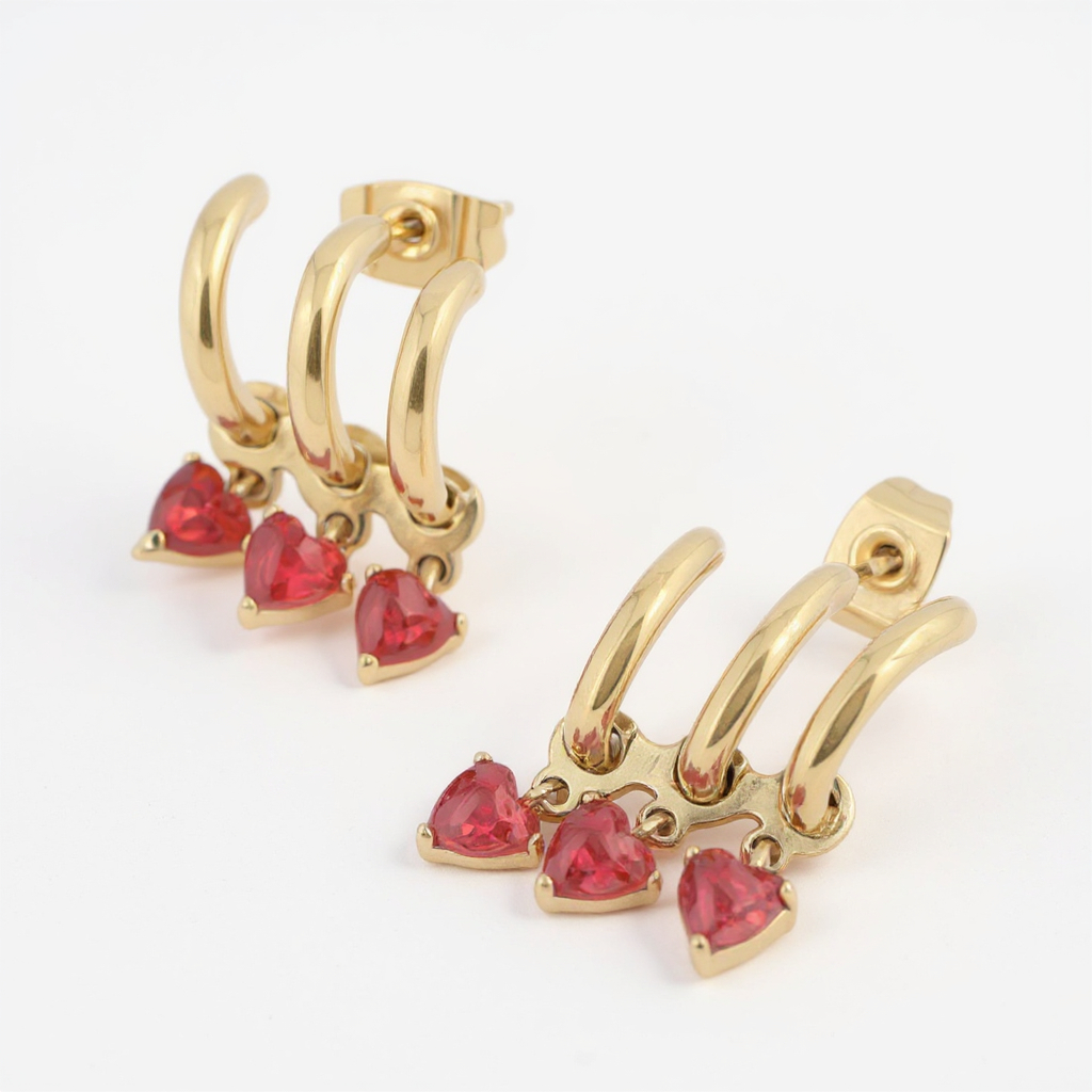 Boucles d'oreilles puces en acier inoxydable composées de 3 demi anneaux sur lesquels sont accrochés 3 coeurs en cristal.