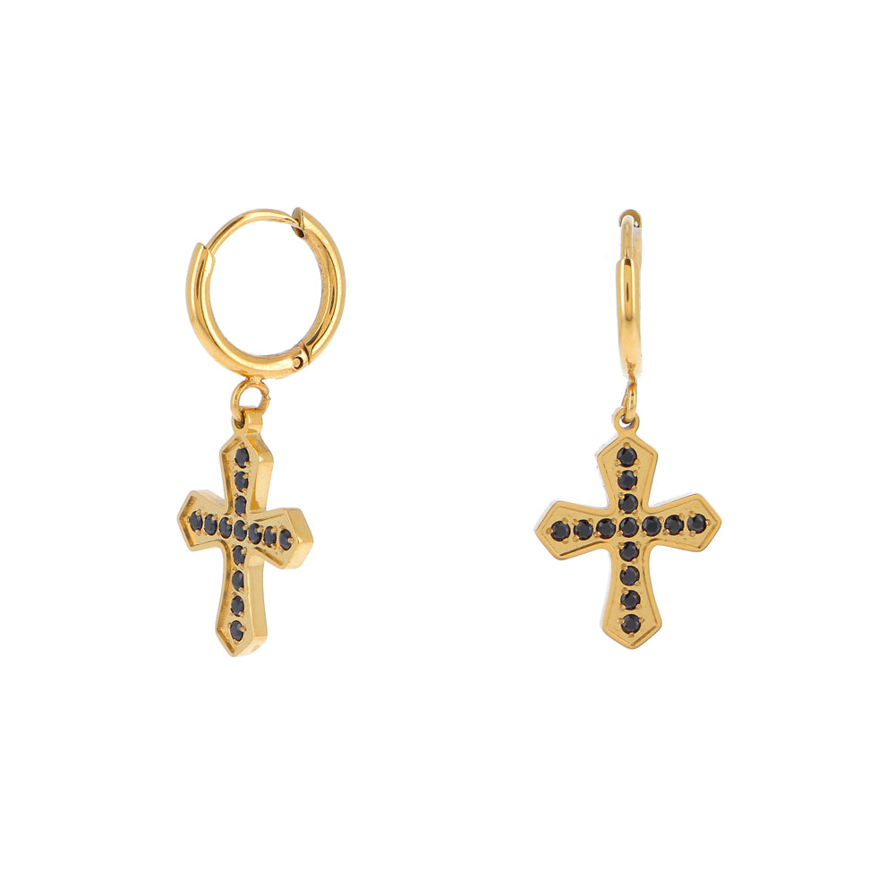 Boucles d'oreilles type créoles à fermoir charnière en acier inoxydable ornées d'une étoile en zirconium. Strass noirs