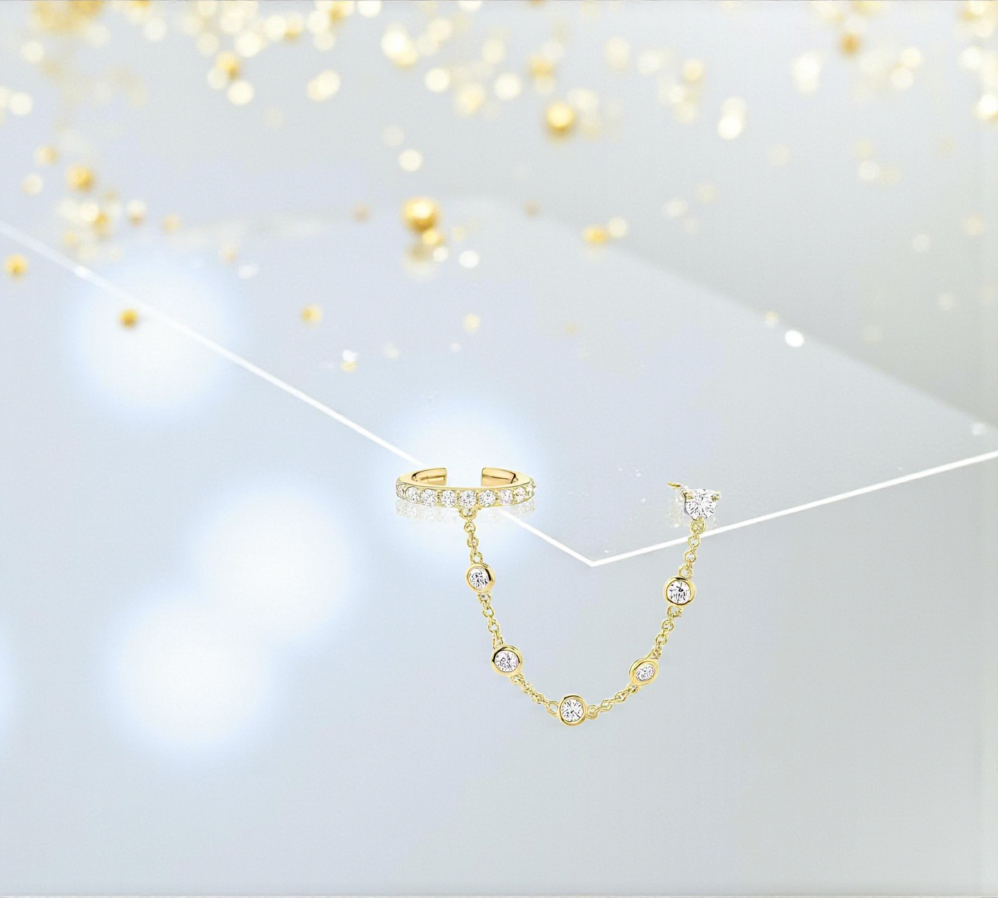 Mono boucle d'oreille - Avec un clou brillant, une chainette avec strass et un anneau à pincer sur le lobe