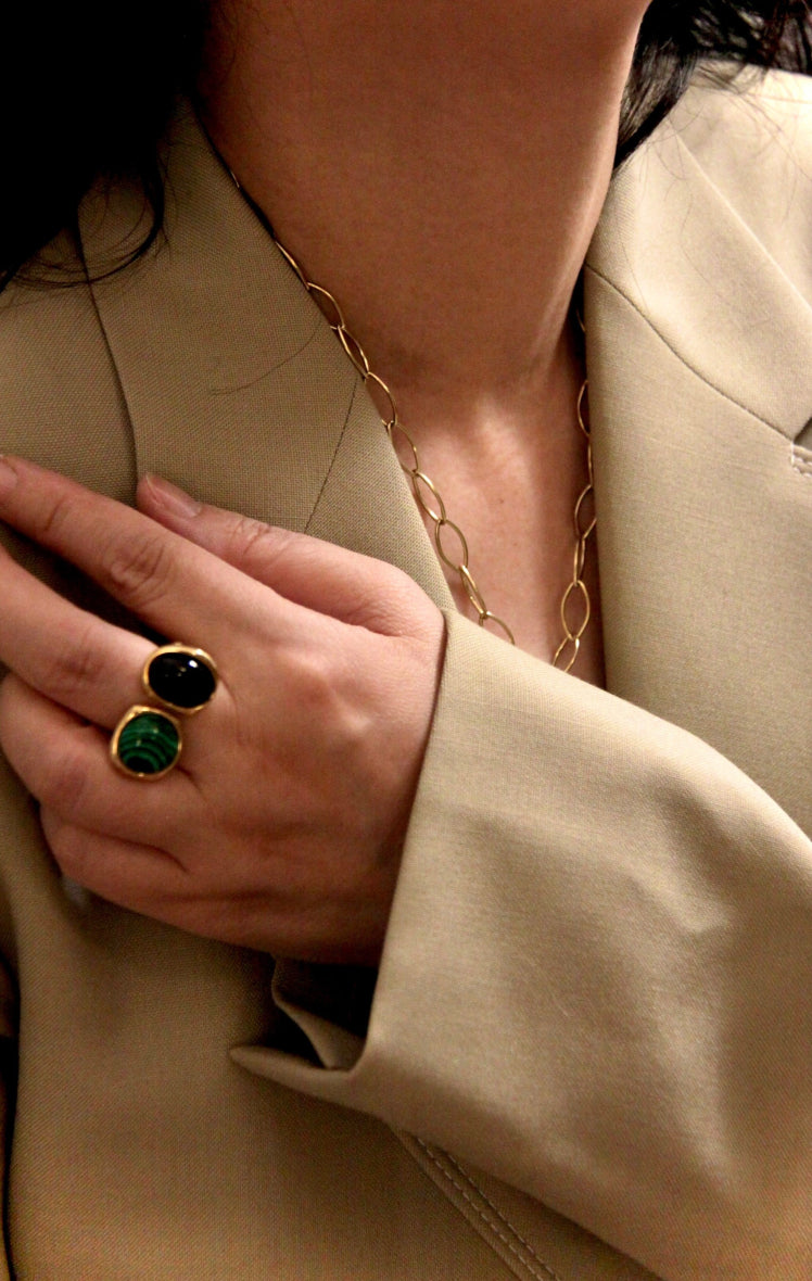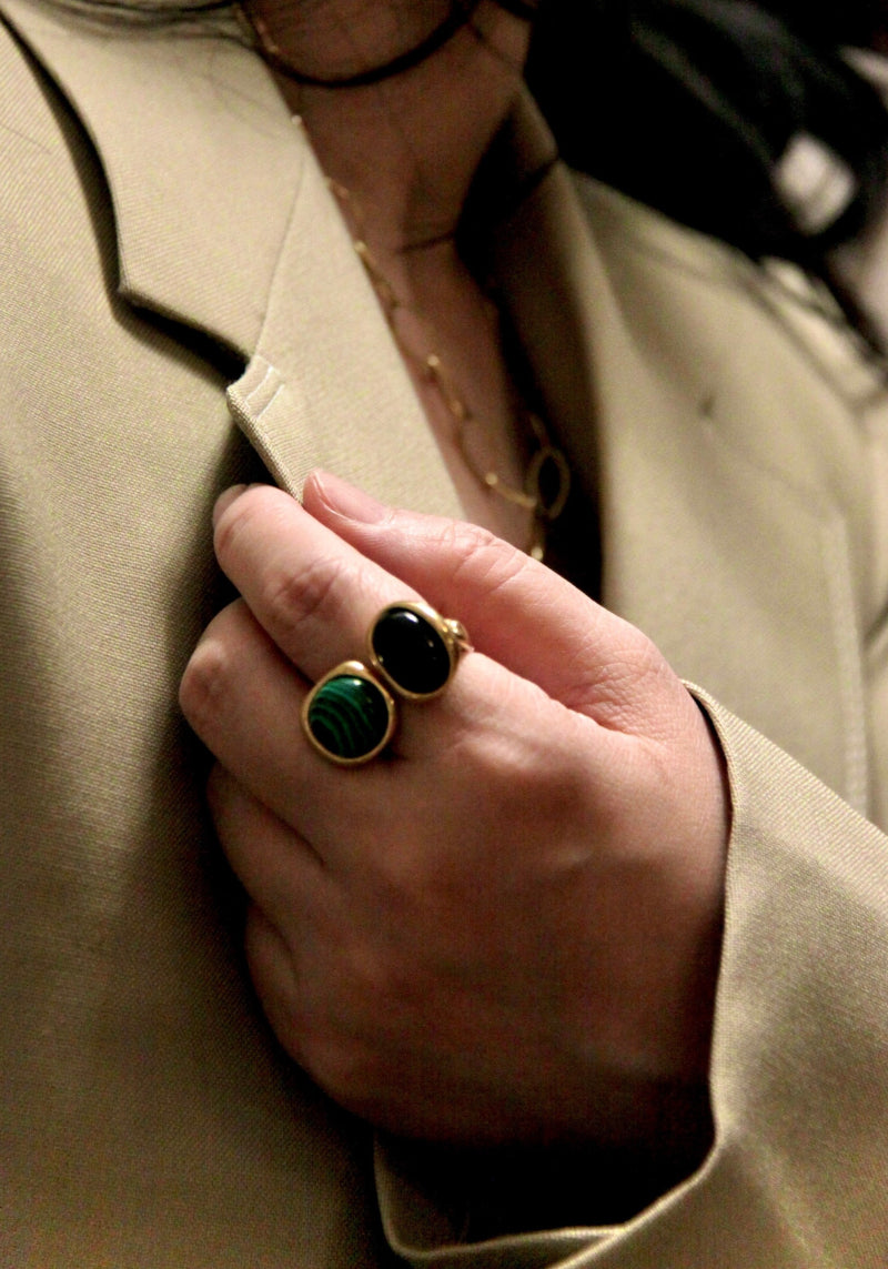Bague ouvert sur le devant avec 2 pierres véritables : 1 malachite et 1 onyx noir
