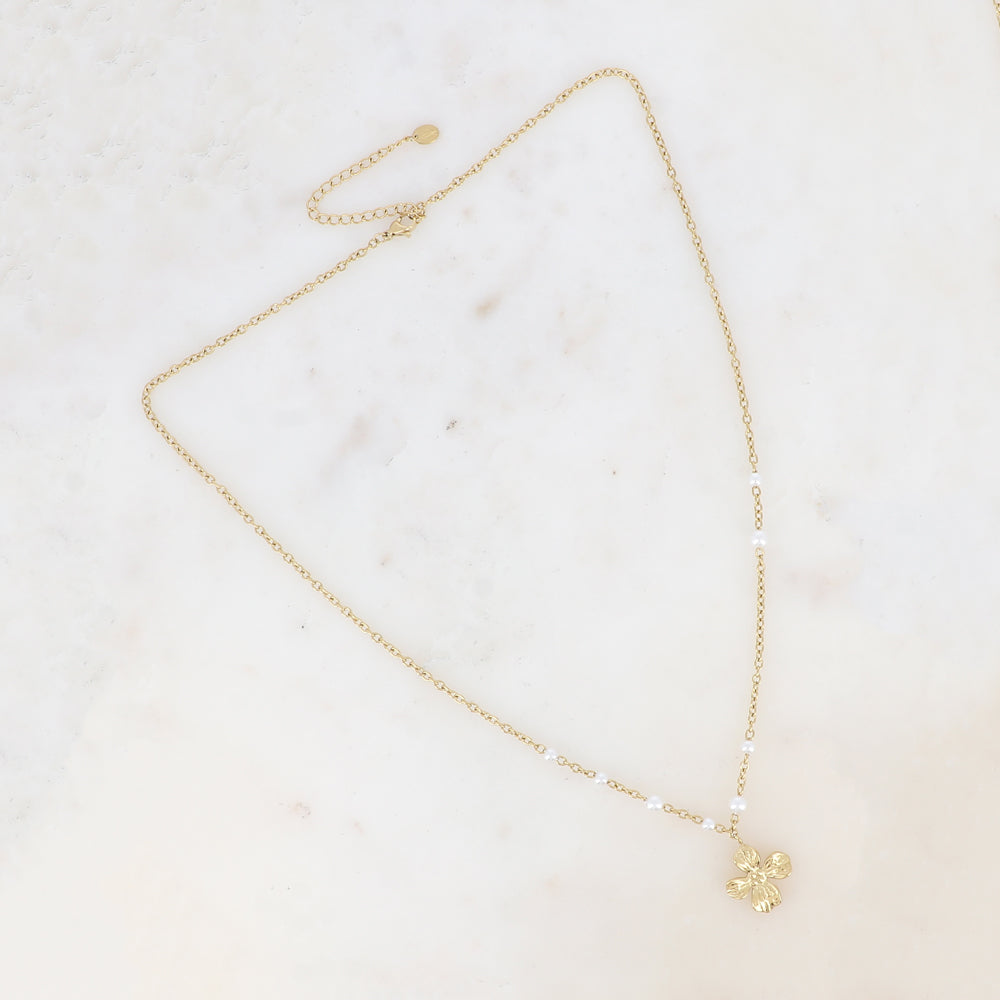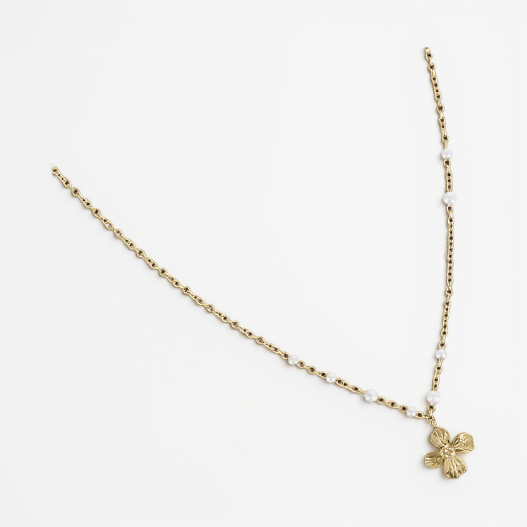 Collier sur chaîne en acier inoxydable composé d'un pendentif en forme de fleur texturée et de petites perles en résine blanche.