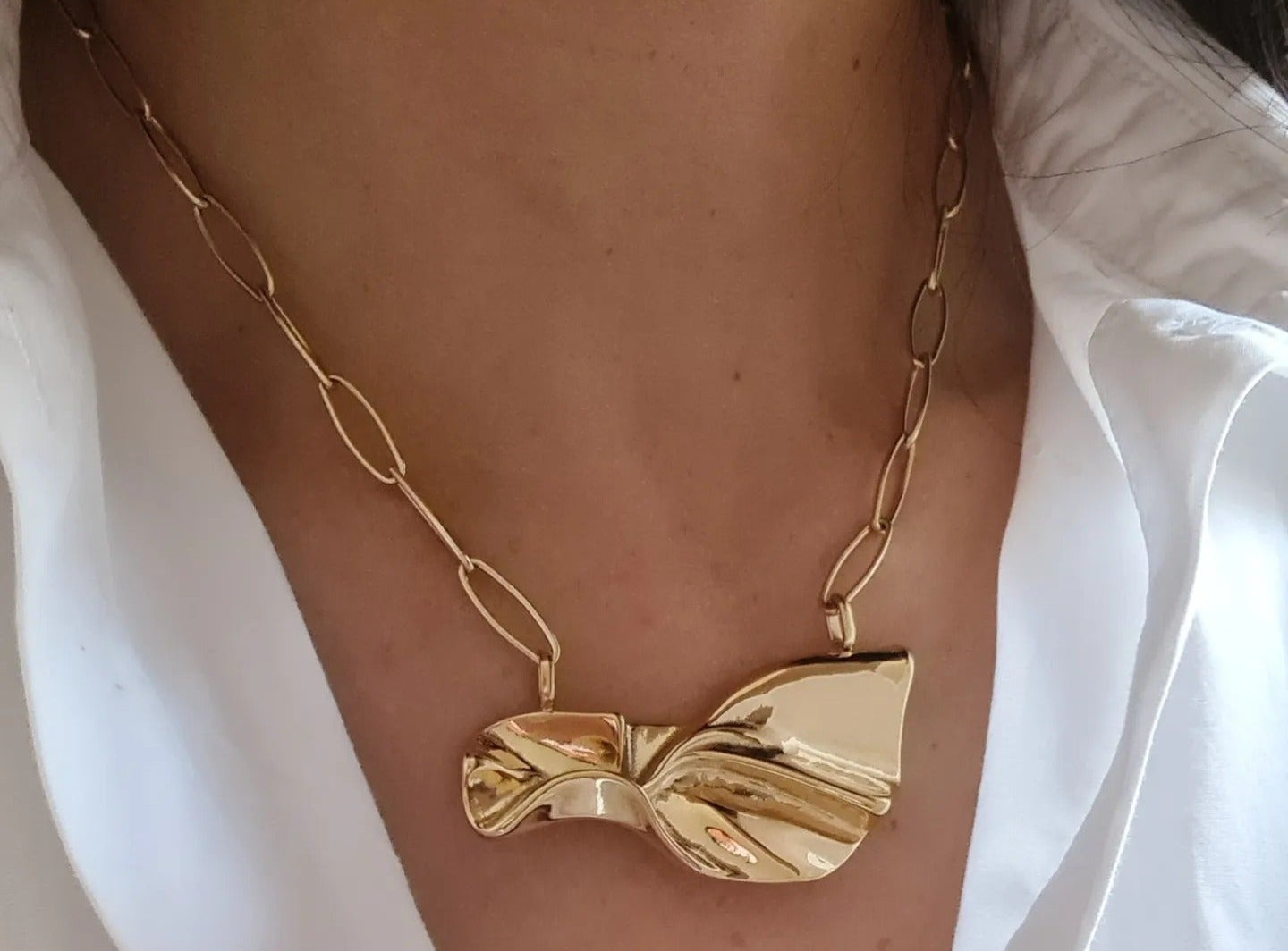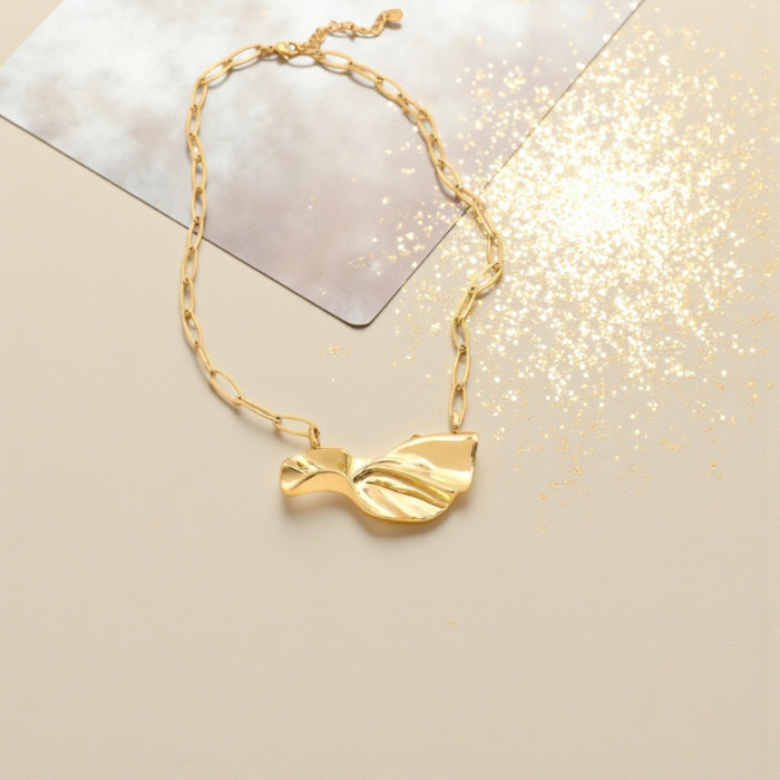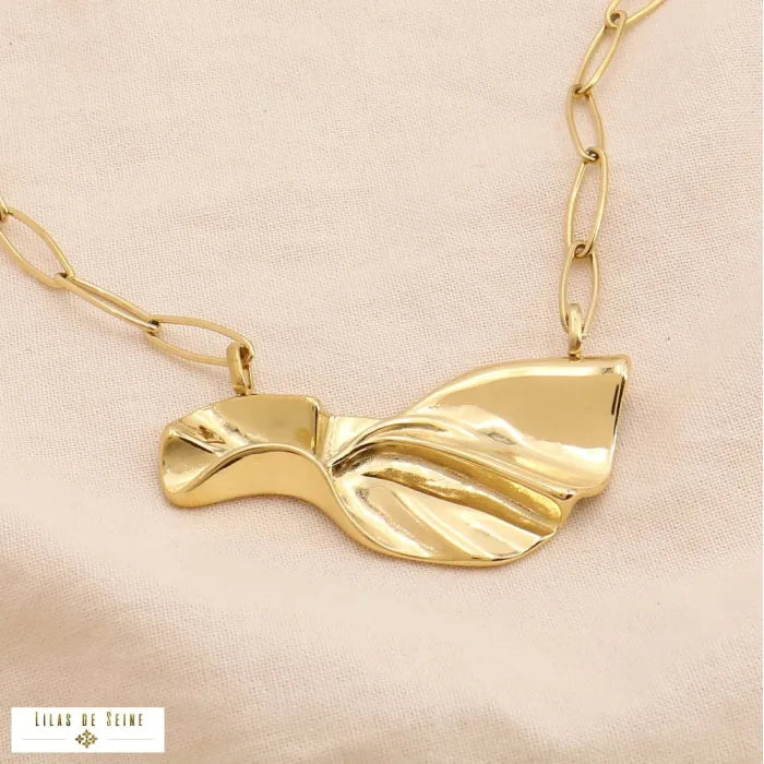 Le pendentif a une forme fluide et organique qui lui donne un aspect contemporain et artistique.