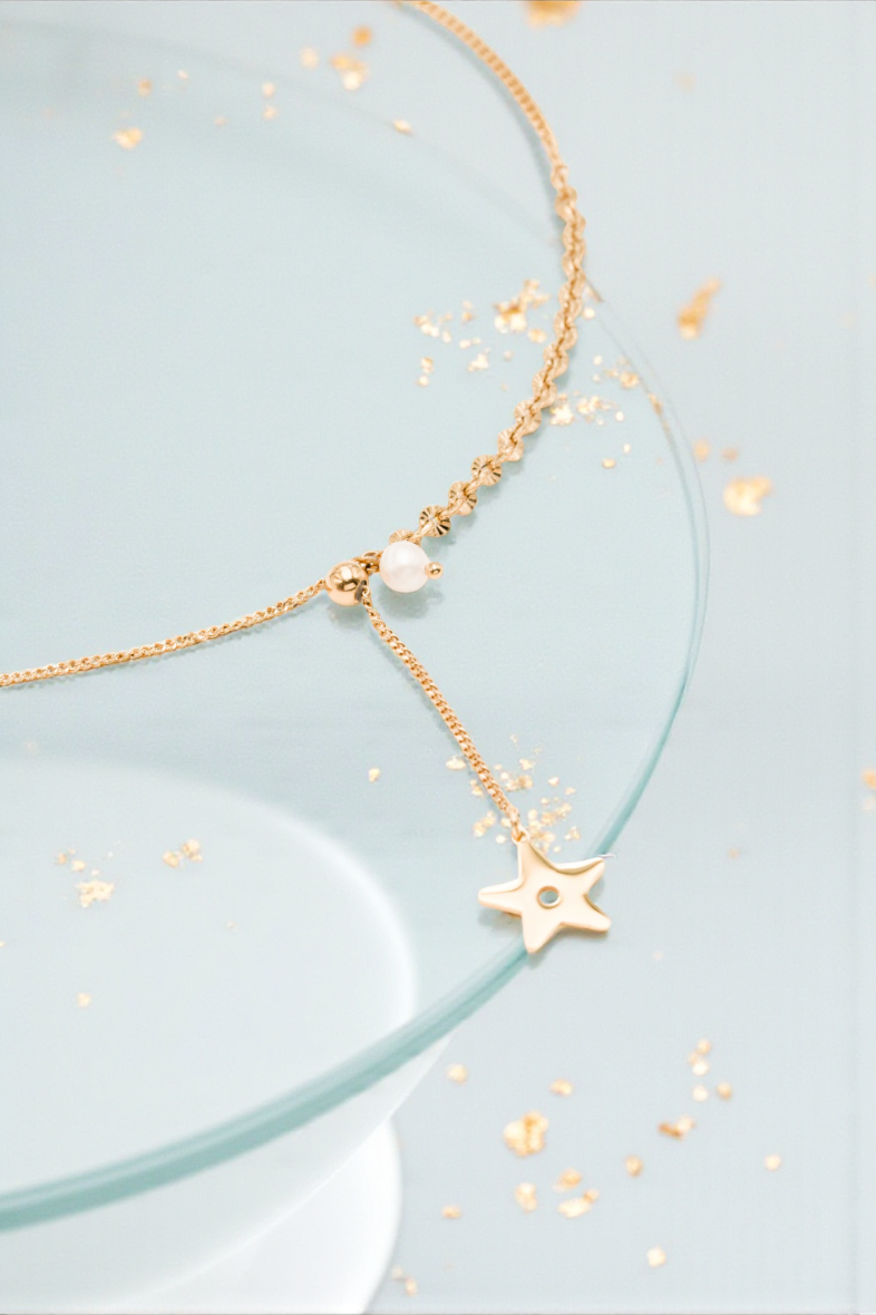 Collier en Y type cravate sur chaîne en acier inoxydable composé d’une maille gourmette fine et d’une maille aux anneaux striés, d’une perle d’eau douce et d’une étoile.
