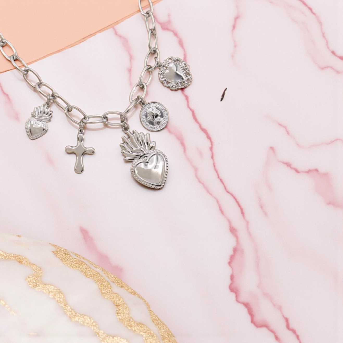 Ce collier chaîne à grosse maille est orné de médaillons et charms (croix, coeur, pièce de monnaie à l'effigie) soigneusement travaillés, mettant en avant des détails sacrés et une finition premium. EXISTE EN BRACELET ET EN ARGENTE