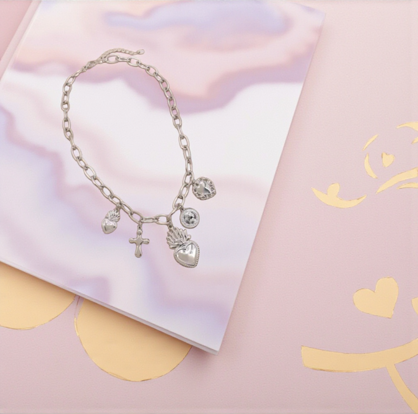 - Design : Chaîne à maillon forçat épais avec pendentifs en forme de cœur sacré, croix et médaillons, ajoutant une dimension symbolique et raffinée.