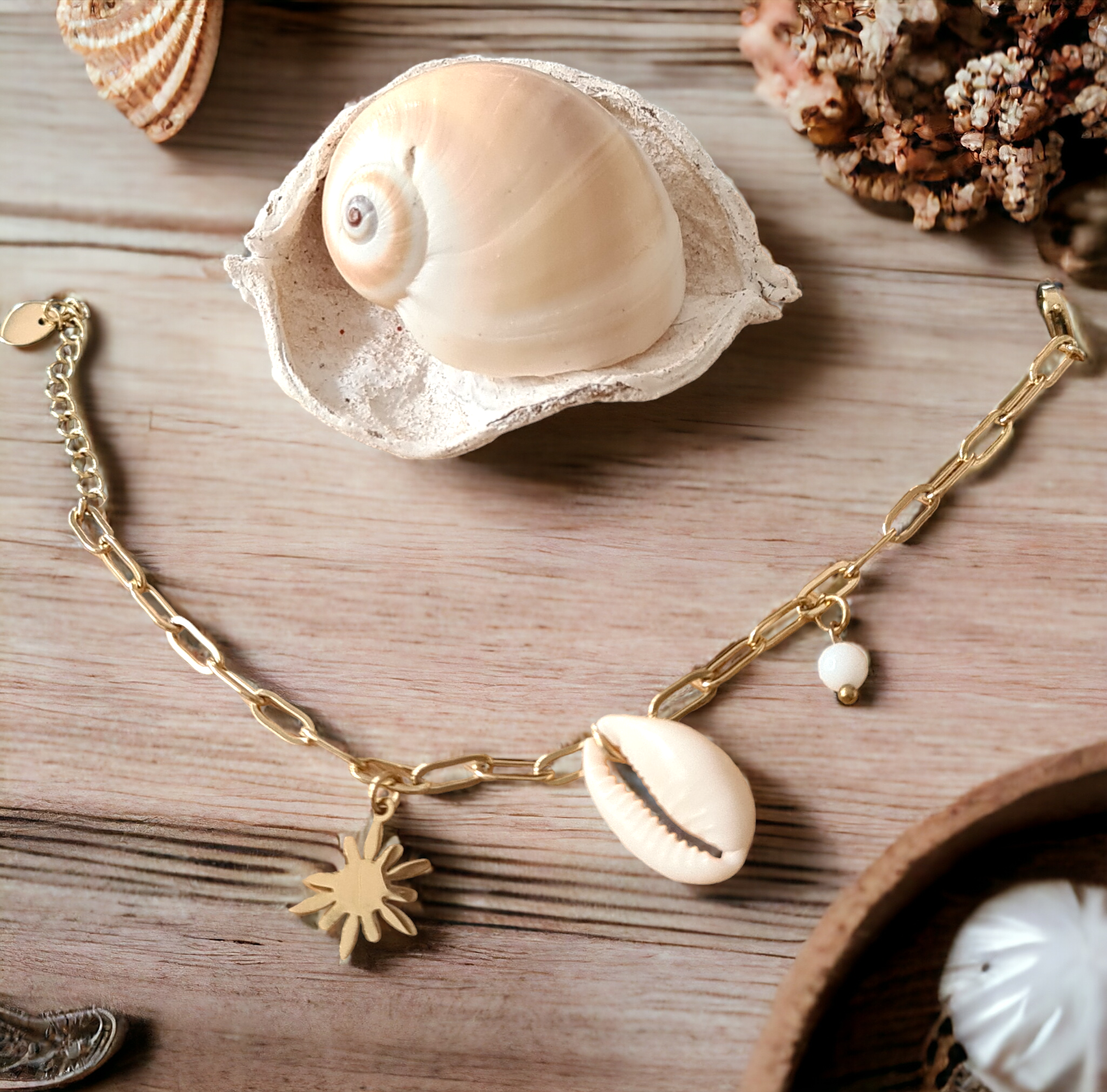 bracelet en acier inoxydable avec pampilles et coquillage