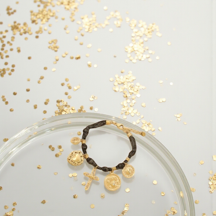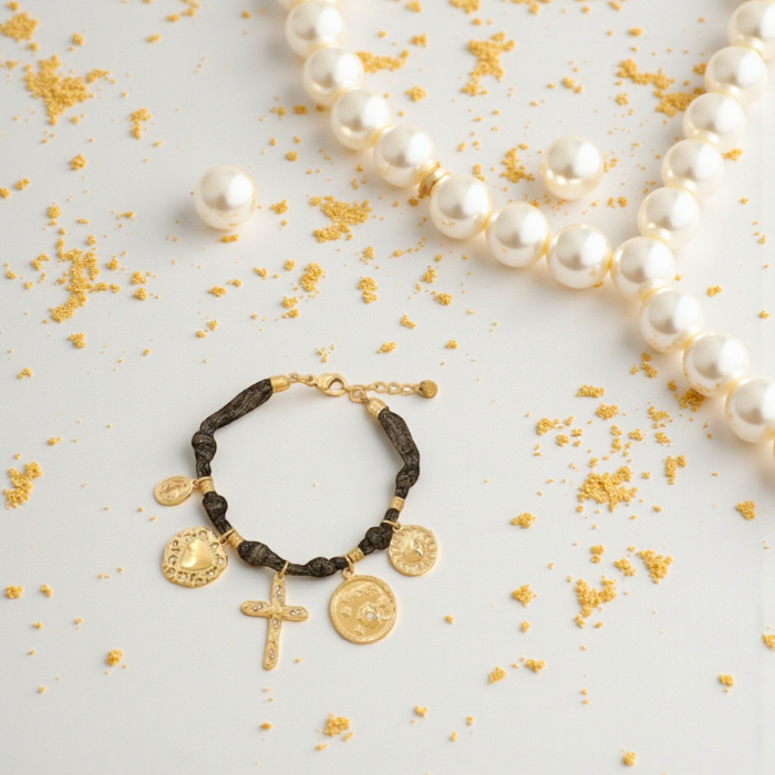 Le style général est à la fois élégant et bohème, avec un design artisanal. Les détails incluent une série de pendentifs symboliques : une croix délicatement sculptée avec strass, un médaillon en forme de cœur ajouré, un médaillon rond avec l'inscription "AMOUR" et avec une fleur et des étoiles , un médaillon rond en forme de soleil avec visage, une médaille ovale représentant la Vierge Marie.