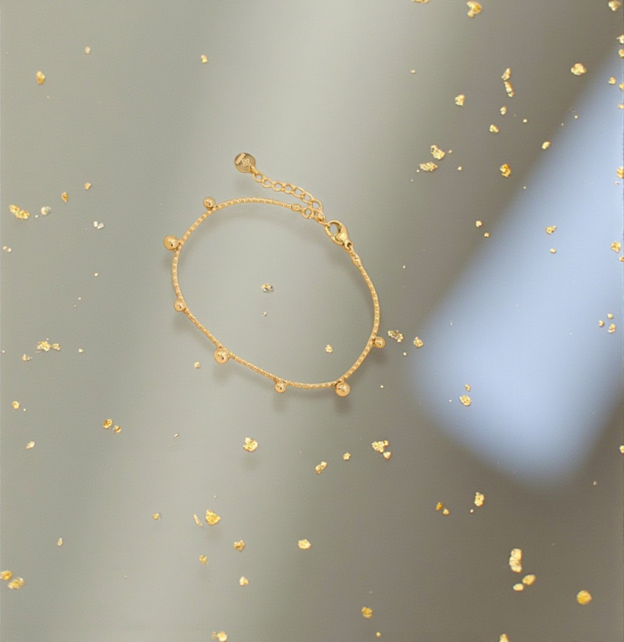 bracelet en acier inoxydable composé d'une fine chaîne de petites billes avec des petites boules suspendues à intervalles réguliers.