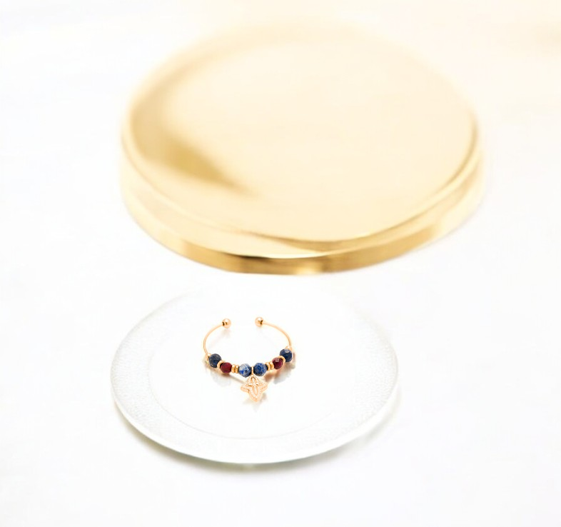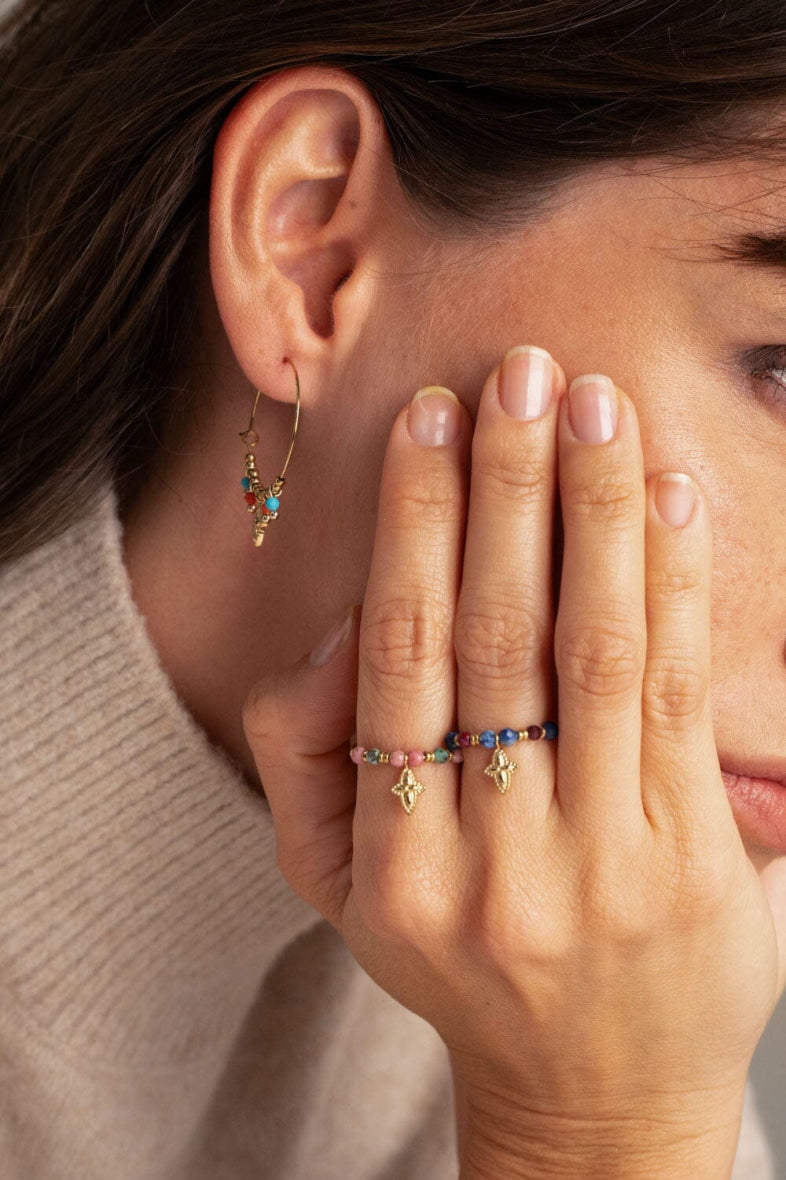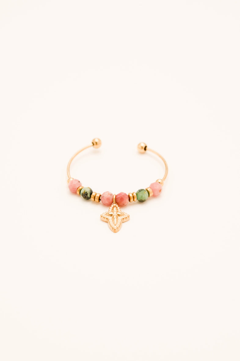 Bague fine en acier inoxydable composée d’une pampille en forme de croix étoilée, de pierres naturelles et de perles. (Rhodonite)