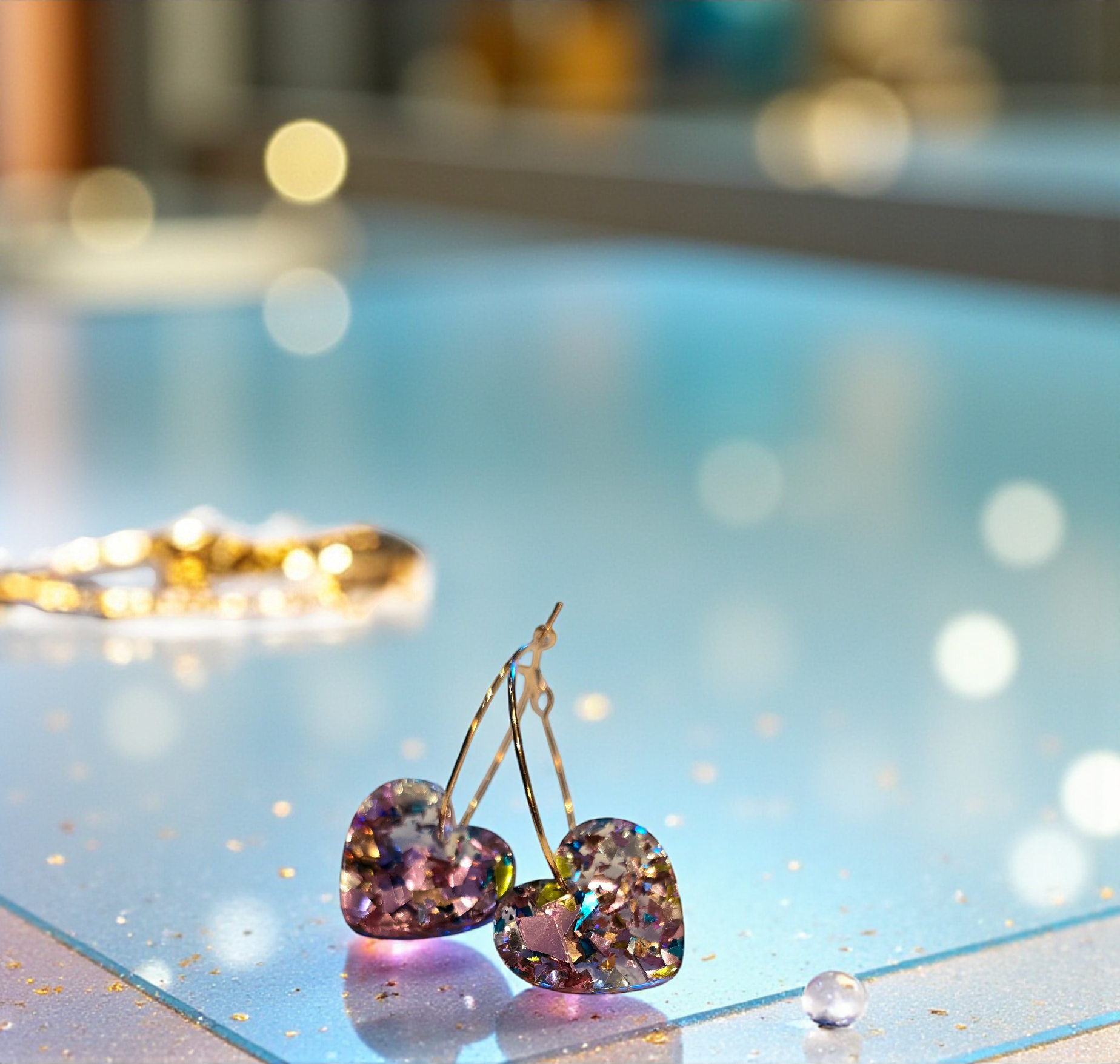 créoles fines avec pendants en forme de coeur avec paillettes dans les tons de rose, parme.