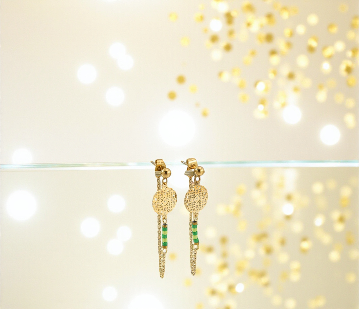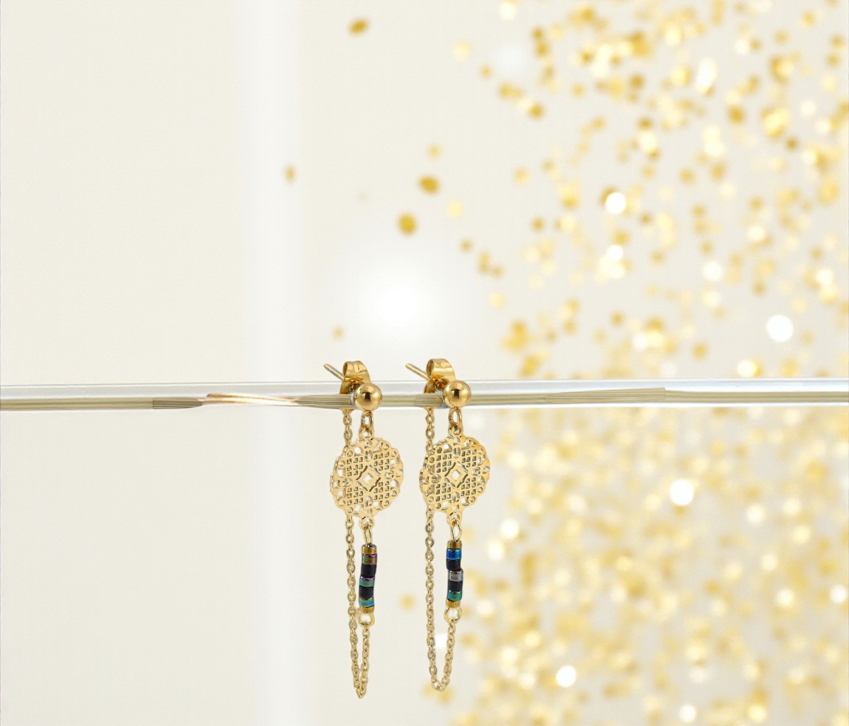 Boucles sur tiges avec chainettes qui s'accroche derriere avec le fermoir poussoir.